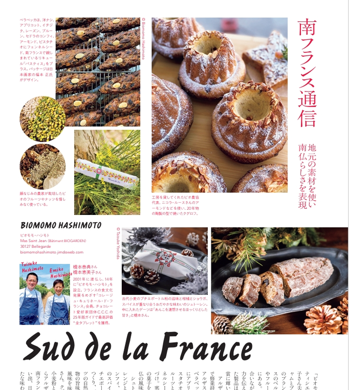 Le marché de Coustellet, surnommé ‘le plus beau marché de Provence’ a lieu dans le village de Coustellet, à 85 km au nord de Marseille, chaque dimanche (hors saison hivernale). Ce marché est devenu célèbre grâce au livre ‘Une année en Provence’ d’écrivain britannique Peter Mayle. Depuis 5 ans, les pâtissiers Taisuké et Emiko HASHIMOTO y participent. Depuis 2007, ils vivent dans cette région, et en 2014, ils ont créé ‘BIOMOMO HASHIMOTO’. Leurs productions de confitures, pâtes à tartiner, ou chocolats confectionnés avec les ingrédients locaux sélectionnés, et reçoivent divers prix aux concours gastronomiques. Emiko et Taisuké se sont rencontrés lorsqu'ils travaillaient chez “Hidemi SUGINO” à Kobé, pâtisserie française très connue au Japon. Pour prouver leur capacité, ils ont décidé de partir en France, et ont commencé à travailler dans des pâtisseries et des restaurants de luxe. Puis un jour, pendant leurs vacances au sud, ils découvrent la terre des Garrigues, cette terre calcaire et rude, recouverte de romarins, de thyms, d’oliviers et de vignes ! De forts arômes sauvages les ont aussitôt conquis. Jusque-là, ils travaillaient dans des grandes villes pour ‘juste travailler’, mais depuis cette découverte, ils ont souhaité travailler dans cette région pour élaborer des produits délivrant au mieux la puissance de ces arômes et ces saveurs. 1 an après, ils s’installent en Provence et commencent à travailler chez un chocolatier utilisant des ingrédients locaux. Un gros changement dans leur vie arrive suite à la rencontre avec Nicolas Reuse, un Suisse qui a commencé l’agriculture biologique très tôt au sud de la France et fondé ‘Biogarden’, Coopérative Agricole de produits Biologiques. Nicolas va alors leur faire découvrir le gingembre bio du Pérou, qui a très bon goût, mais qui est compliqué à travailler à cause de sa texture très fibreuse. Mais Taisuké et Emiko ont réussi à créer des chips-confits dont Nicolas était très satisfait et leur proposa ainsi de soutenir leur projet en laissant utiliser une espace dans son hunger de Biogarden. Les Hashimotos ont découvert en même temps les saveurs étonnantes du fruit bio que les producteurs cultivent avec soin, et ont alors décidé de créer leur entreprise en se fournissant chez ces agriculteurs. En France, la confiture est réglementée et doit contenir plus de 55% de sucre pour être commercialisée, donc très souvent, les fruits sont mijotés avec une quantité de sucre qui doit satisfaire ces taux. Emiko et Taisuké ont réfléchi à un moyen pour profiter au maximum du sucre naturel du fruit, et ont trouvé le processus concentrant le goût sucré naturel en séparant l’eau et le fruit. Lorsqu’on met un peu de sucre sur les fruits, un liquide sort due à la pression osmotique. On le met sur le feu pour en faire du sirop, on le verse sur les fruits puis on laisse reposer 24h. Le lendemain, on refait le sirop à partir du liquide dégorgé et on le verse sur les fruits… En répétant 7 fois ce processus, le taux de sucre a pu atteindre 55%. C’est avec beaucoup de temps et de soin qu’ils ont réussi à faire concentrer les saveurs des fruits crus. C’était le Praliné de Matcha, mélange de thé Matcha et d’amandes bio, qui a fait connaître le nom de BIOMOMO. Les amandes fraîches et le Matcha avec ses Umami et arômes se marient parfaitement. En 2018, cette Praliné-Matcha a obtenu la Médaille d’Or en catégorie Pâte à Tartiner au Concours de Revue Professionnelle “Le Monde de l’Epicerie Fine”. En 2019, leur confiture ‘Figue et pétales de rose’ a obtenu la Médaille d’Or en catégorie Confiture. En 2020, la Médaille de Bronze en catégorie confiserie avec “MOMO3CHOCS ”, mélange d’amandes enrobées de chocolat et de gingembre confit. En 2021 et en 2022, plusieurs prix leur ont été attribués en catégorie Chocolat, et la réputation des produits de BIOMOMO ne cesse d’augmenter. Bruno LECOQ, jury et chef de la rédaction de la revue-organisateur, apprécie les produits de BIOMOMO « la saveur est précise et de très haute qualité. Le fait d’utiliser des produits locaux est positif pour l’avenir et il y a une bonne originalité ». En 2020, BIOMOMO a également reçu le Prix d’Innovation (prix spécial des jurys) de la part de French Gourmet Food, qui apporte son soutien aux PME et qui a